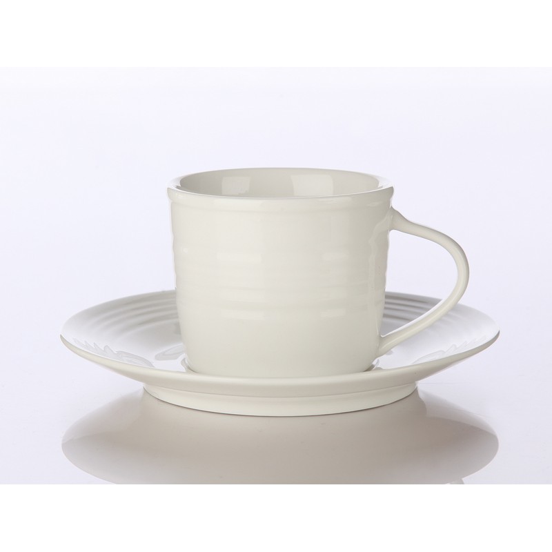 Φλιτζάνι με πιάτο από λευκή πορσελάνη. Έχουν διάκοσμο από οριζόντιες ανάγλυφες γραμμές. Συνδυάζονται με τσαγιέρα ιδίου διάκοσμου.